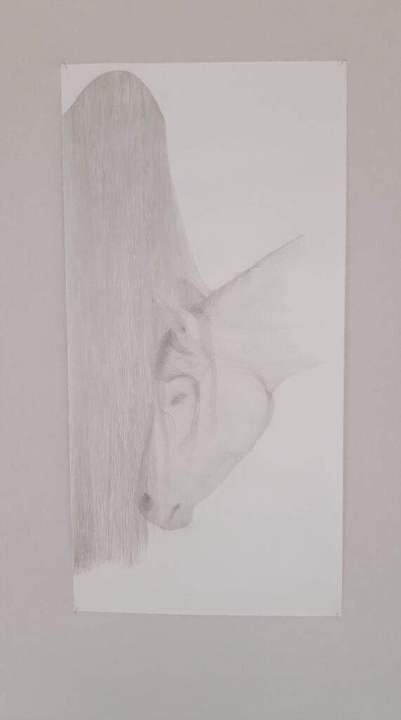 In het najaar begonnen aan dit deze grote tekening, nu bijna klaar, Zonder titel (Hands up), gemengde techniek, potlood en zilververf op papier, 240x190cm, 2024, veel zilveren handen aaien/ betasten een paard.